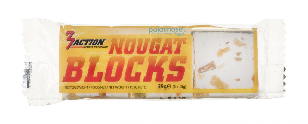 3Action Nougat Blocks is een zachte fruit-nougat voor snelle aanvoer van extra energie. De Nougat Blocks kunnen worden gebruikt voor het aanvullen van de koolhydraattekorten tijdens en na de inspanning en/of de energiereserves vóór het sporten. Door de verpakking in 3 afzonderlijke porties, zijn de 3Action Nougat Blocks gemakkelijk te doseren tijdens de inspanning. De 3Action Nougat Blocks wordt geleverd per sachet à 39 gram.