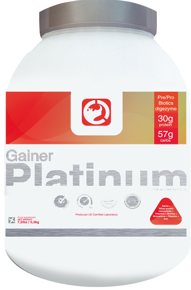 Gainer Platinum bevat 30 gram proteïne, 57 gram koolhydraten, prebiotische en probiotische enzymen, vitaminen en mineralen.