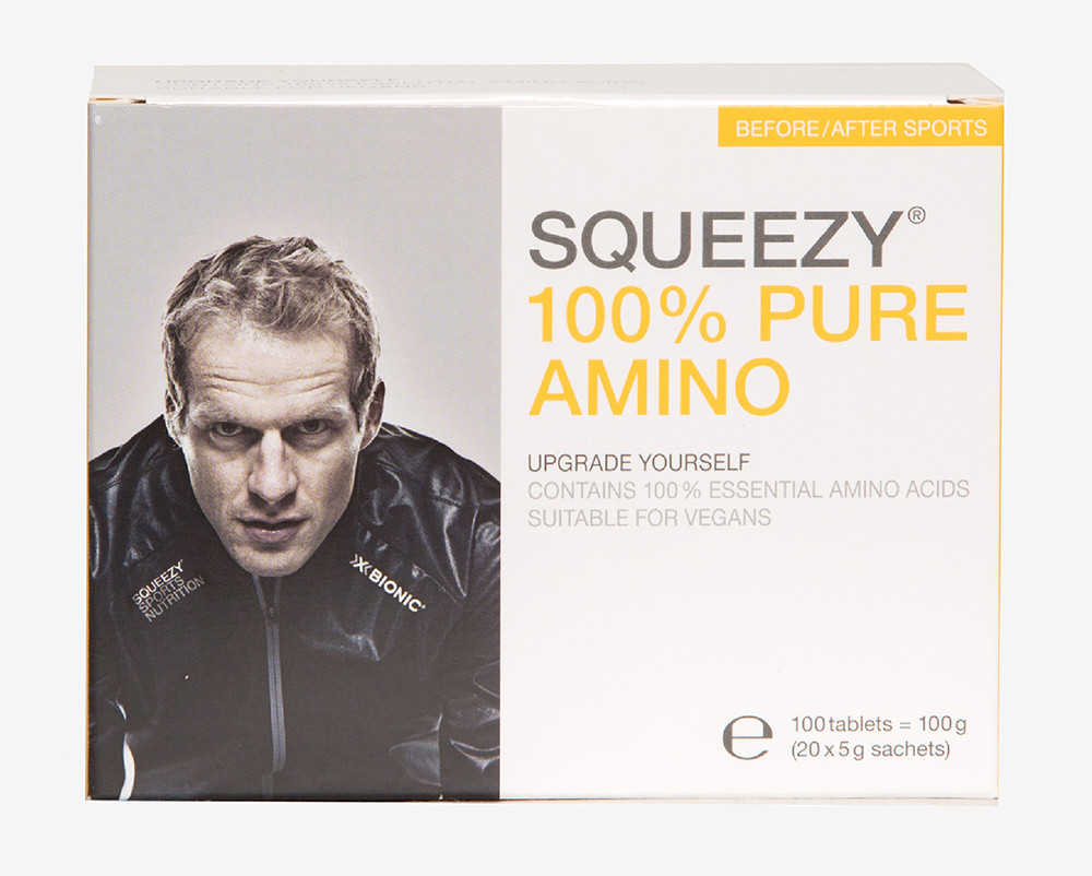 - Elke verpakking Squeezy 100% PURE AMINO bevat 20 sachets van 5 tabletten (elk 1 gram).