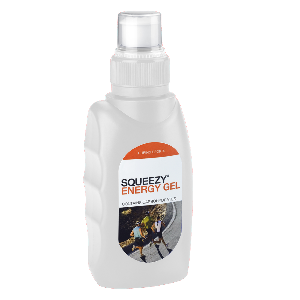 Squeezy energy gel racer bottel is een handig ergonomisch ontworpen flesje met handgrip en hersluitbaar dopje dat via de mond vlot open en dicht kan, de gel is vloeibaar en vlot te gebruiken, er zitten 83 gram koolhydraten in 1 racer bottel, deze verpakking kan terug aangevuld worden met de Refiller fles welk de inhoud van 4 racer bottels bevat, zo kan men de racer bottel hergebruiken.