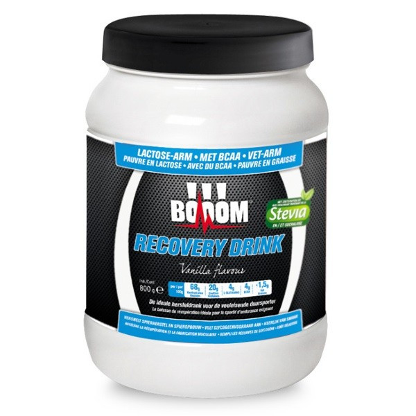 BOOOM Recovery drink is verkrijgbaar in een pot van 800 gram en 3 smaken. Het is van groot belang om na het sporten zo snel mogelijk de glycogeenvoorraden aan te vullen. Het aanvullen van de glycogeenvoorraad gaat het snelst binnen twee uur na de inspanning. Indien er aan de koolhydraten eiwitten worden toegevoegd, dan verloopt de opname van de koolhydraten in de spieren sneller dan wanneer er alleen koolhydraten gebruikt worden. Vanwege de vloeibare samenstelling wordt de BOOOM recovery drink binnen een half uur door het lichaam opgenomen. Door de toevoeging van BCAA aminozuren zorg je voor een snel spierherstel. Het product is lactose arm en vetarm. Dit vanwege de natuurlijke zoetstof Stevia die de BOOOM Recovery Drink bevat.