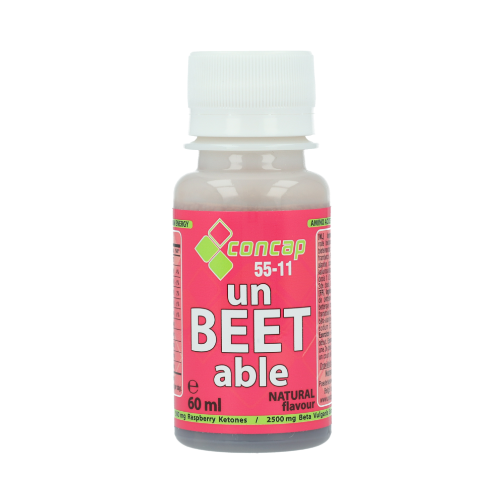 Concap un-BEET-able 55-11 is een shot met een unieke combinatie van rode bietextract, frambozenketonen, aminozuren en pure nitraten. Dit natuurlijke supplement is speciaal ontwikkeld voor sporters die hun prestaties willen ondersteunen.