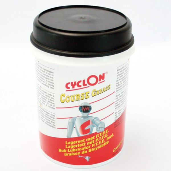 Cyclon ® Course Vet is een sterk hechtend vet met zeer goede waterbestendigheid, antislijtage en anticorrosie eigenschappen. Cyclon® Course Vet bevat P.T.F.E. waardoor soepele en langdurige smering gewaarborgd wordt. Ook vormt dit vet een kraag langs de naafranden, zodat er geen vuil en water kunnen binnendringen.