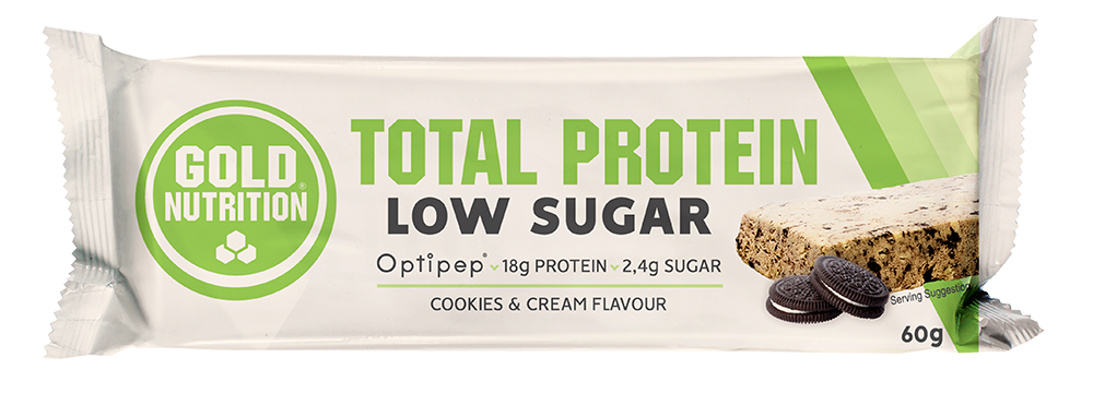 De Total Protein Low Sugar Bar is een hyperproteïnereep waarvan de eiwitten afkomstig zijn van melk. Deze reep bevat een mengsel van melkeiwit met OPTIPEP® 4Bars, een gehydrolyseerd hoogwaardig wei-eiwitconcentraat dat zorgt voor een zachte textuur.