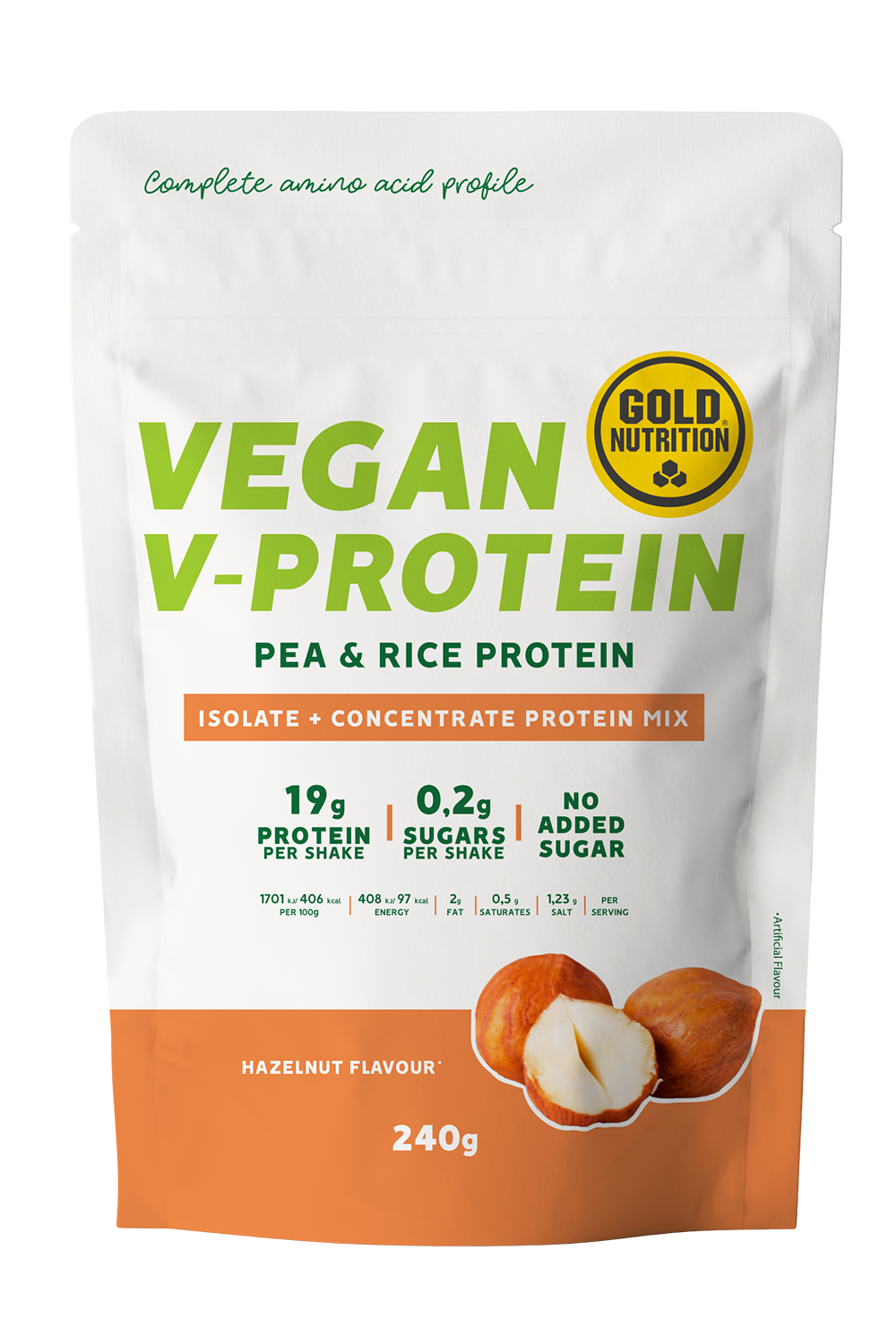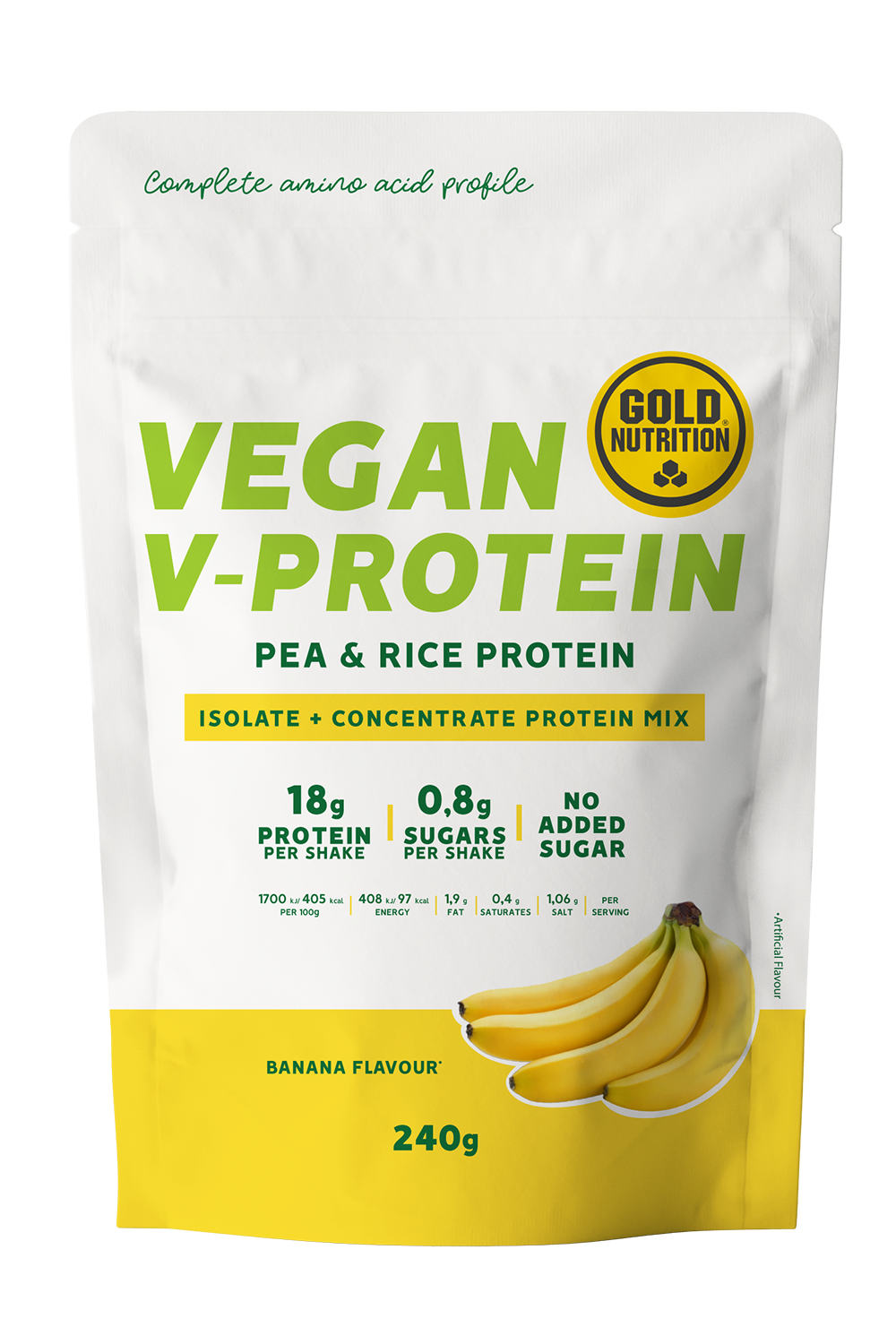 GoldNutrition Vegan V-Protein is een product dat rijk is aan plantaardige eiwitten (83%) uit erwten en rijst. Het bevat alle essentiële aminozuren voor het lichaam, zonder toegevoegde suikers, en bevat minder dan 1 g suiker per shake.