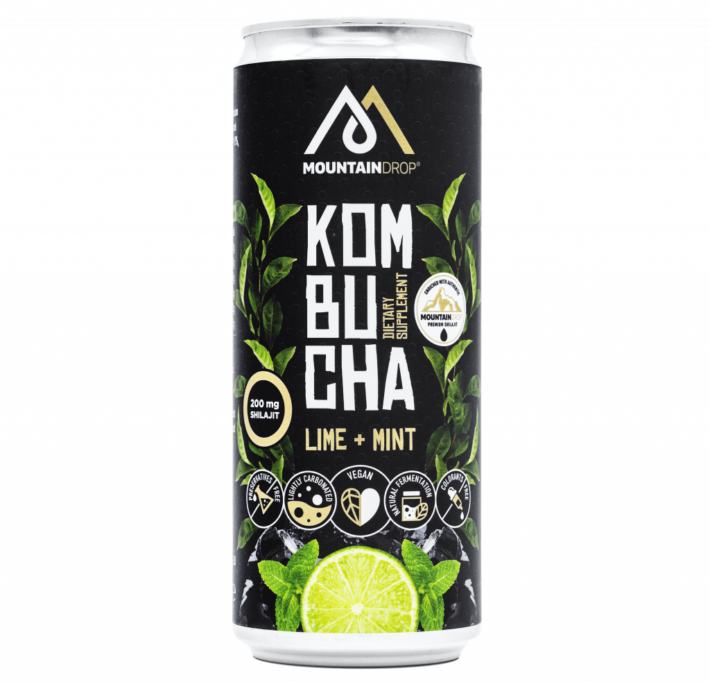 Ingrediënten: Water, groene thee met limoen smaak <2%, munt <2%, Mountaindrop Shilajit 200mg, suiker, kooldioxide, kombucha-cultuur.