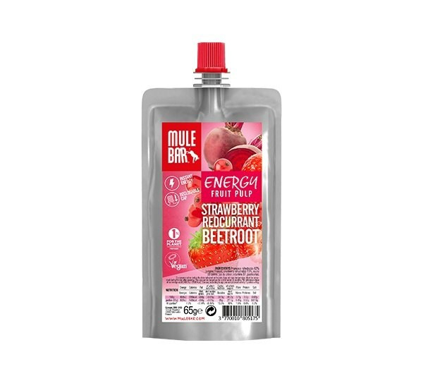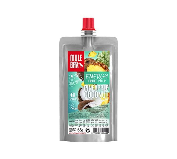 MuleBar Fruit Pulp Pouch op basis van echt fruit! Consumeer hem in twee of drie keer dankzij de hersluitbare dop en plaats hem eenvoudig in de achterzak van je wielertrui.