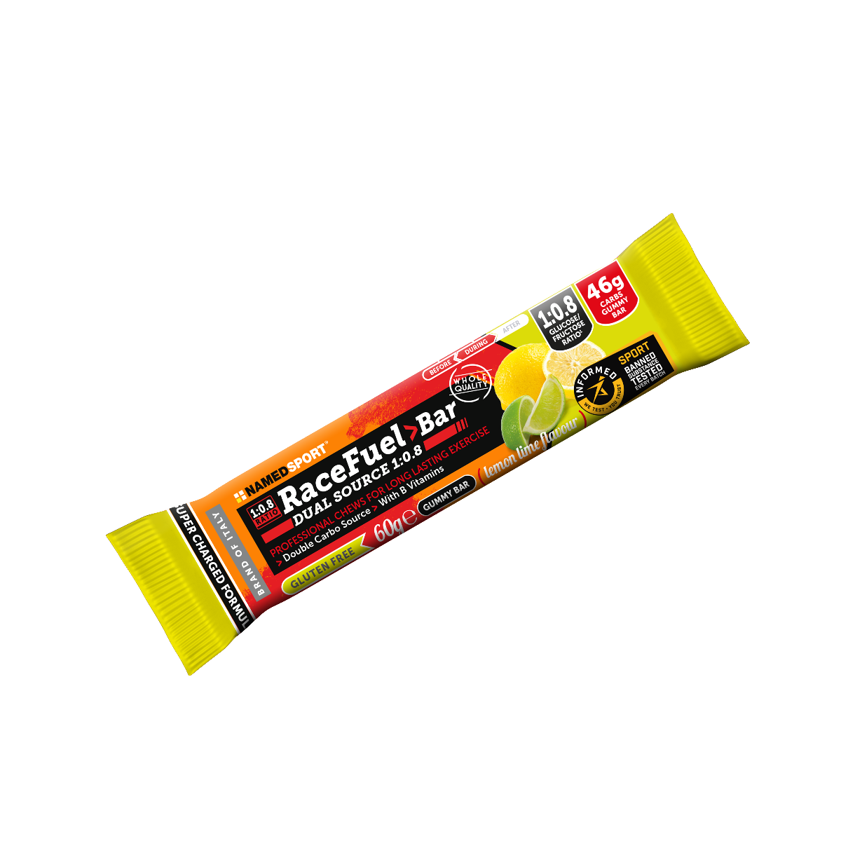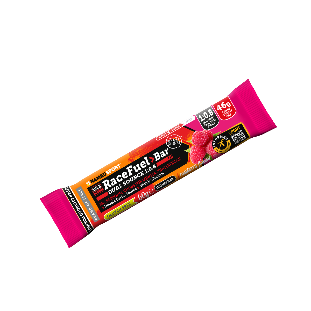 De Namedsport Race Fuel Bar is een compacte en makkelijk kauwbare energiereep, ontworpen voor intensieve sportmomenten en duurinspanningen. De reep bestaat uit twee zachte blokken van elk 30 gram, op basis van snel opneembare koolhydraten met een optimaal glucose:fructose-verhouding van 1:0,8 voor maximale opname. Verkrijgbaar in drie smaken: Framboos, Lemon-Lime en Cola-Lime. De Cola-Lime variant bevat bovendien 80 mg cafeïne per reep.