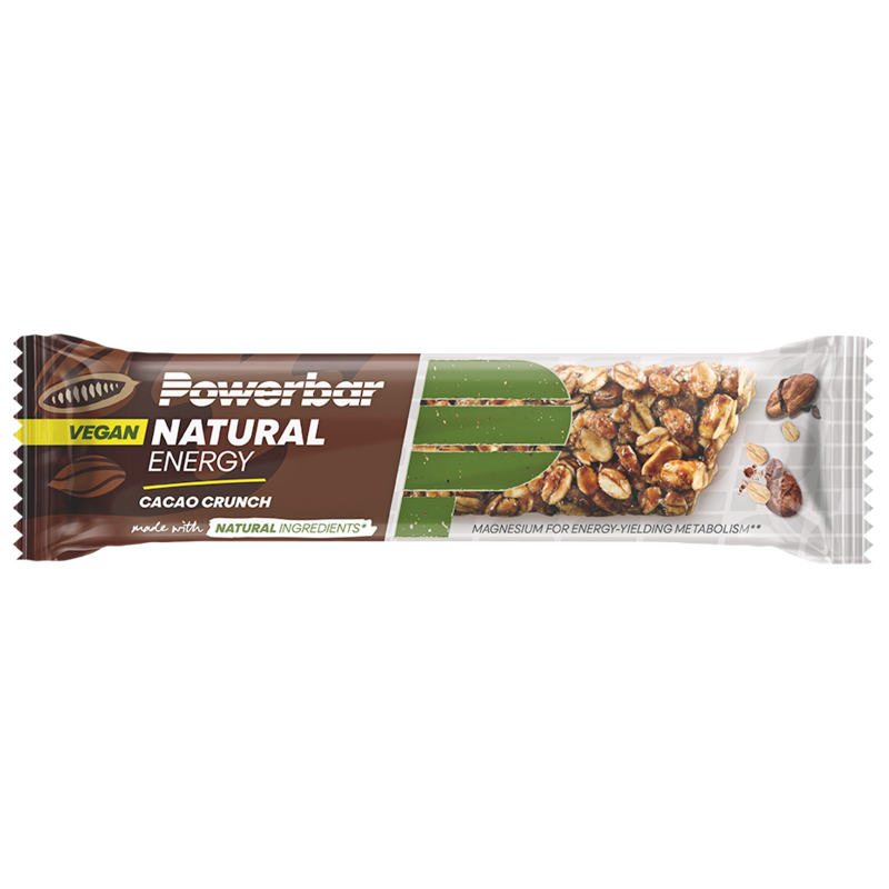 Ingrediënten Powerbar Natural Energy Bar Cacao Crunch: Volle havermout* (29%), invertsuikersiroop, maltodextrine*, volkoren krokante stukjes (12%), [volkoren tarwemeel*, rijstmeel*, suiker*, gemoute gerstmeel*, gemoute tarwemeel*, zout, koolzaadolie*, zuurteregelaar (calciumcarbonaat), emulgator (lecithines (soja))], glucosestroop, cacaomassa* (5%), sojabonen*, pure chocolade (4%) [cacaomassa*, suiker*, emulgator (lecithines (soja)), natuurlijk vanillearoma*], kokosolie, magnesiumcitraat, bevochtigingsmiddel (glycerol), zout, emulgator [lecithines (soja)], vanille-extract*. natuurlijk ingrediënt. Kan sporen bevatten van: pinda'snoten en melk.