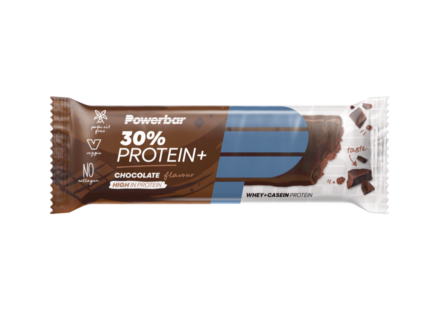 Powerbar 30% Protein+ Bar Chocolate: Calciumcaseïnaat (melk) (21%), couverture van pure chocolade (18%) [cacaomassa, suiker, cacaoboter, emulgator (lecithine (soja))], invertsuikerstroop, fructosestroop, oligofructosestroop, wei-eiwit (melk) (8%), magere cacaopoeder (5%), soja-eiwit, smaakstoffen, emulgator [lecithines (soja)]. Kan sporen bevatten van tarwe, gest, haver, pinda’s, hazelnoten, amandelen, cashewnoten, pistache noten en gluten.