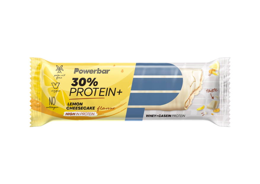 Powerbar 30% Protein+ Bar Lemon Cheesecake: Calciumcaseïnaat (melk) (22%), witte chocolade (18%) [suiker, cacaoboter, volle melkpoeder, emulgator (lecithine (soja)), aroma], oligofructosestroop, fructosestroop, invertsuikerstroop, wei-eiwit (melk) (8%), magere melkpoeder, soja-eiwit, natuurlijk citroensmaakstof met andere natuurlijke aroma's, emulgator [lecithines (soja)]. Kan sporen bevatten van: tarwe, gest, haver, pinda's, hazelnoten, amandelen, cashewnoten, pistache noten en gluten.