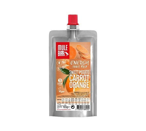 MuleBar Fruit Pulp Pouch op basis van echt fruit! Consumeer hem in twee of drie keer dankzij de hersluitbare dop en plaats hem eenvoudig in de achterzak van je wielertrui.