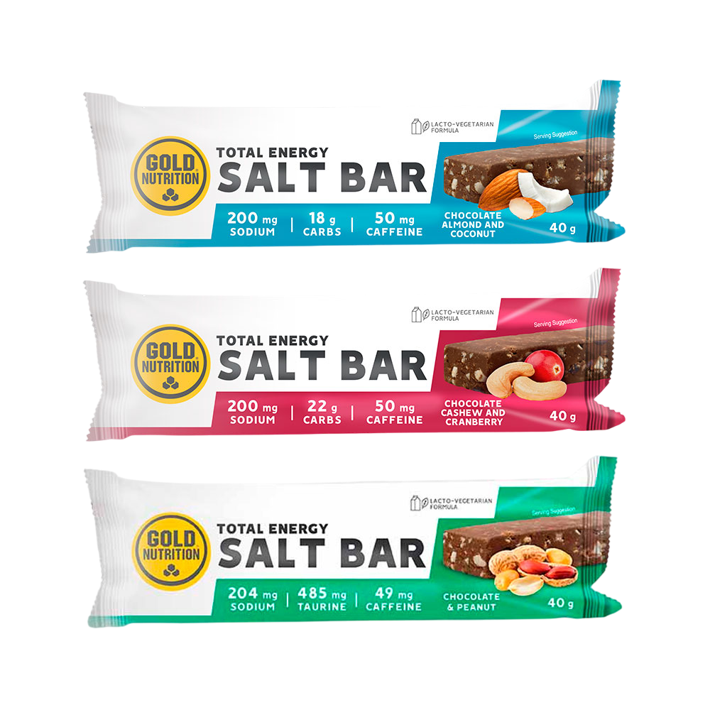 GoldNutrition Total Energy Salt Bar is een innovatieve energiereep die zoete, zoute en cafeïnesmaken combineert, ideaal voor duursporters om te consumeren tijdens hun trainingen en wedstrijden.