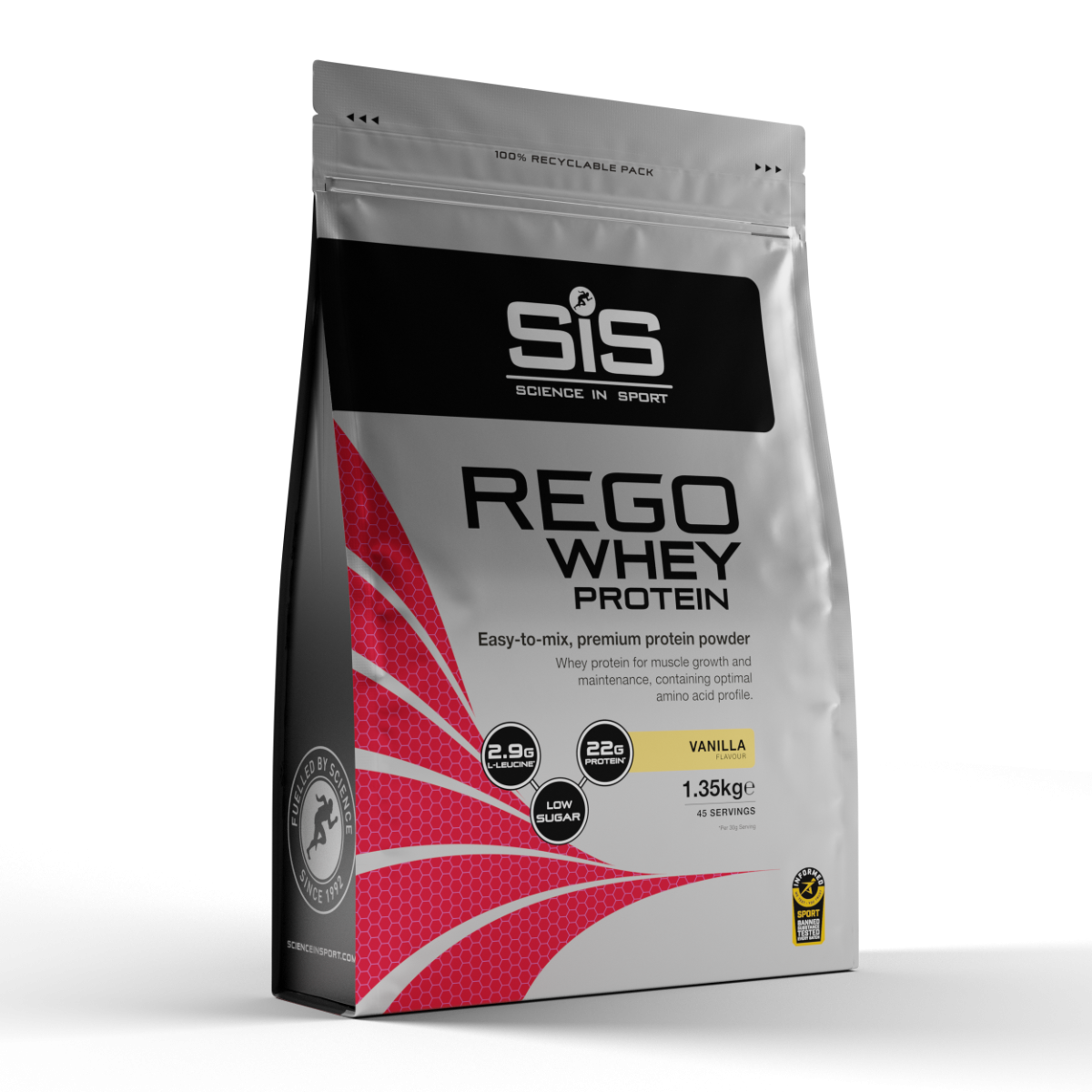 SIS REGO Whey Protein levert de perfecte combinatie van 22 g hoogwaardig wei-eiwit, 2,8 g L-leucine en een compleet aminozuurprofiel om spiergroei en -onderhoud te ondersteunen na je trainingen.