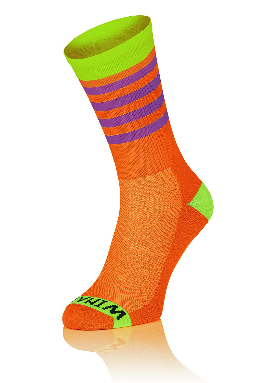 WINAAR OGV stripes zijn unieke hoge fietssokken in de kleur oranje-groen met paarse strepen. De WINAAR OGV stripes sokken zijn gemaakt van hoge kwaliteit polypropyleen (97%) en elastan (3%) en hebben een goede pasvorm.